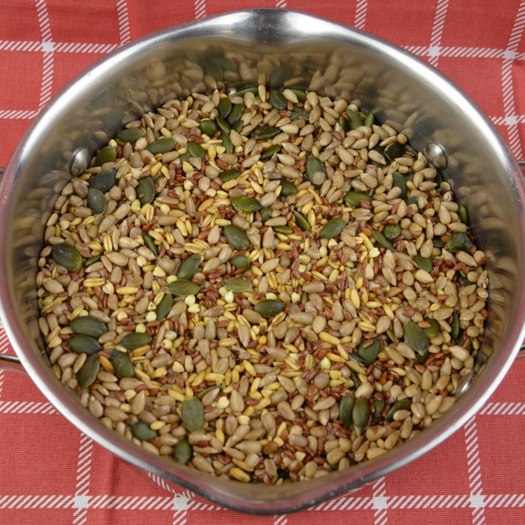2. Meersalz, Körner und Saaten gründlich vermischen und mit dem kochenden Wasser übergießen. Noch einmal gut verrühren und ebenfalls abgedeckt bei Raumtemperatur ziehen lassen.
